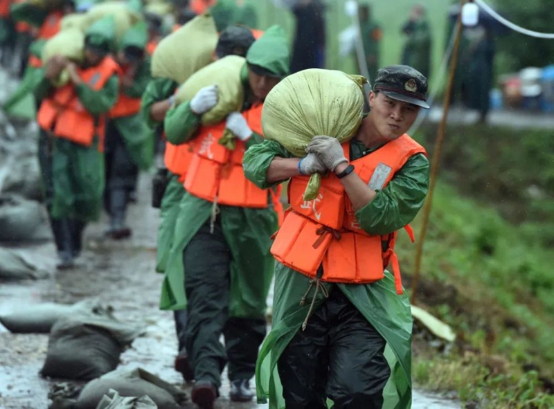 和平年代,面對波濤洶涌的洪水,解放軍官兵、民兵、消防救援人員緊急搶險救災(zāi)。老百姓則紛紛走出家門,給搶險救災(zāi)人員送去食物,送去溫暖: