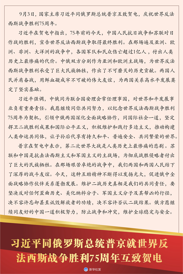 習(xí)近平同俄羅斯總統(tǒng)普京就世界反法西斯戰(zhàn)爭勝利75周年互致賀電