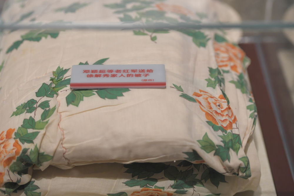 “在湖南汝城縣沙洲村,3名女紅軍借宿徐解秀老人家中,臨走時(shí),把自己僅有的一床被子剪下一半給老人留下了?!?/p>