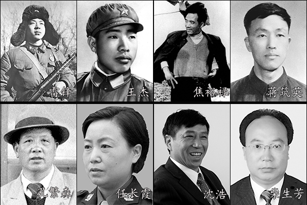 雷鋒、王杰、焦裕祿、蔣筑英、孔繁森、任長(zhǎng)霞、沈浩、柴生芳……