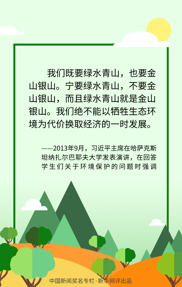 綠水青山就是金山銀山。沿著這條從綠水青山中開辟的道路,把綠水青山就是金山銀山的理念轉(zhuǎn)化為扎扎實(shí)實(shí)的行動,在綠水青山中走出一條生態(tài)美、產(chǎn)業(yè)興、百姓富的可持續(xù)發(fā)展之路,我們一定能把綠水青山建得更美,把金山銀山做得更大,真正實(shí)現(xiàn)青山常在、清水長流、空氣常新。(文字:董璐 海報:滕華)