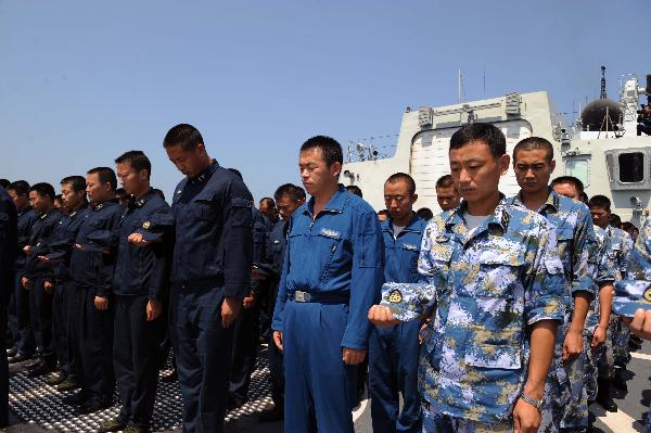 中國海軍護航編隊舉行默哀儀式悼念舟曲特大山洪泥石流遇難同胞