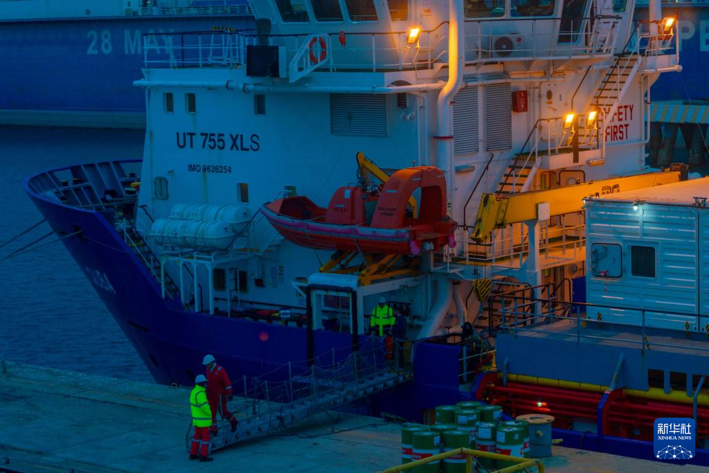 2月10日,在阿塞拜疆巴库船厂码头,工作人员对参与海上作业的船舶进行补给。新华社记者 陈俊锋 摄