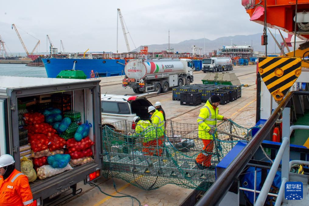 2月10日,在阿塞拜疆巴库船厂码头,工作人员对参与海上作业的船舶进行食物补给。新华社记者 陈俊锋 摄
