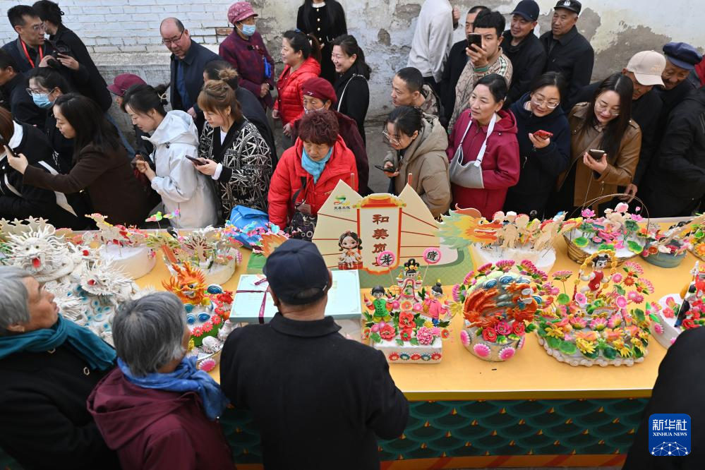 3月28日,在山西省岚县岚城镇,人们用手机拍摄面塑作品。