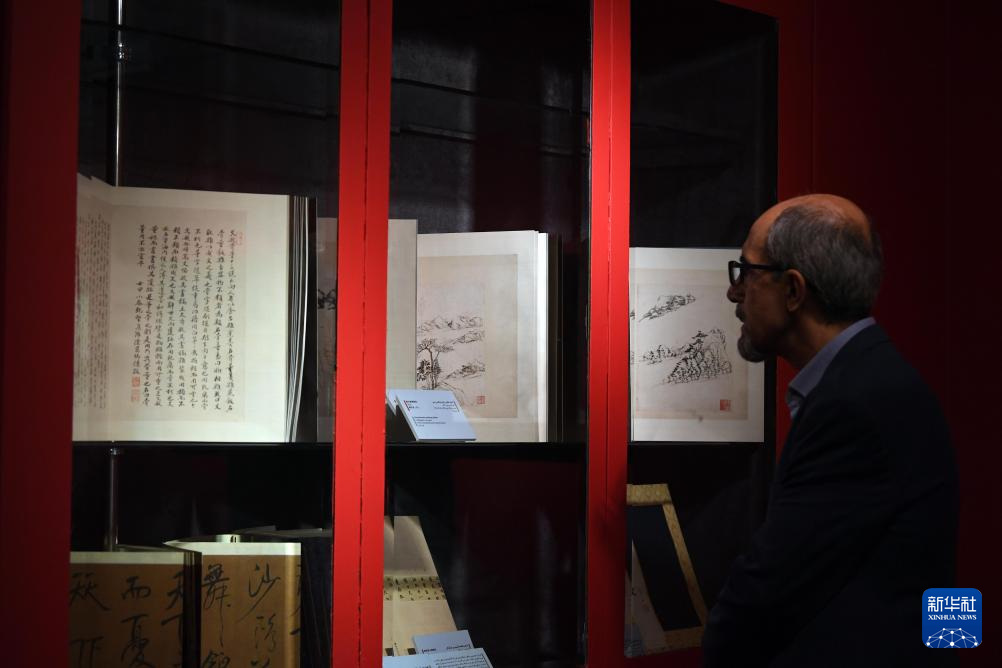 10月12日,一名男子在伊朗首都德黑兰的马利克国家博物馆参观“丝路长云——中国艺术文化精品展”。