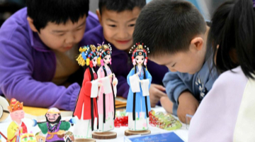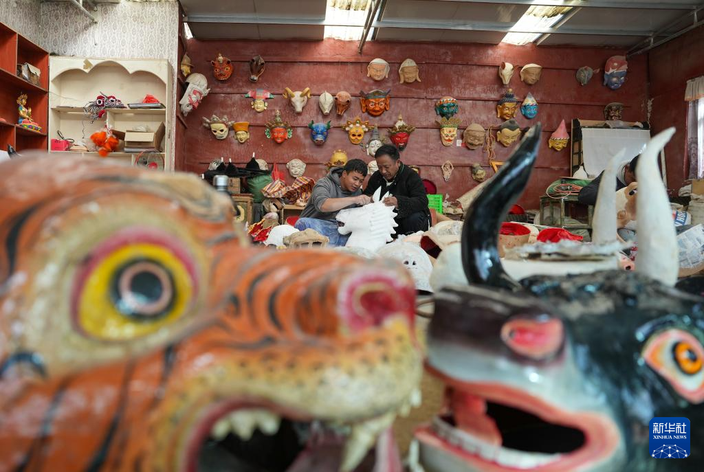 12月9日,西洛(左一)和同事交流西藏传统面具制作心得。