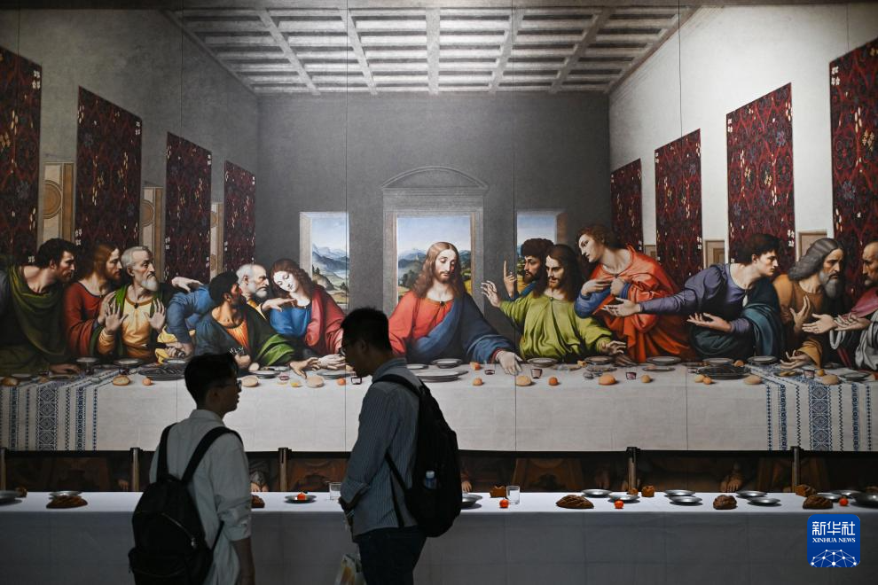 这是6月5日拍摄的展览上展出的数字复原的《最后的晚餐》。
