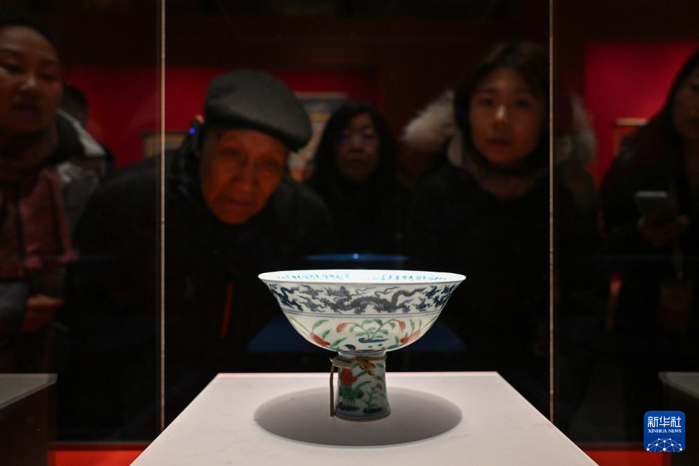 2月9日,参观者在展览上观看明代景德镇窑青花五彩满池娇图靶碗。