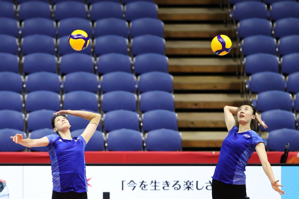 2019年9月21日,中国女排球员李盈莹(左)和王媛媛在训练中练习发球。当日,中国女排在日本札幌进行训练,备战将于9月22日至24日在札幌举行的2019年女排世界杯第二阶段比赛。新华社记者 杜潇逸 摄