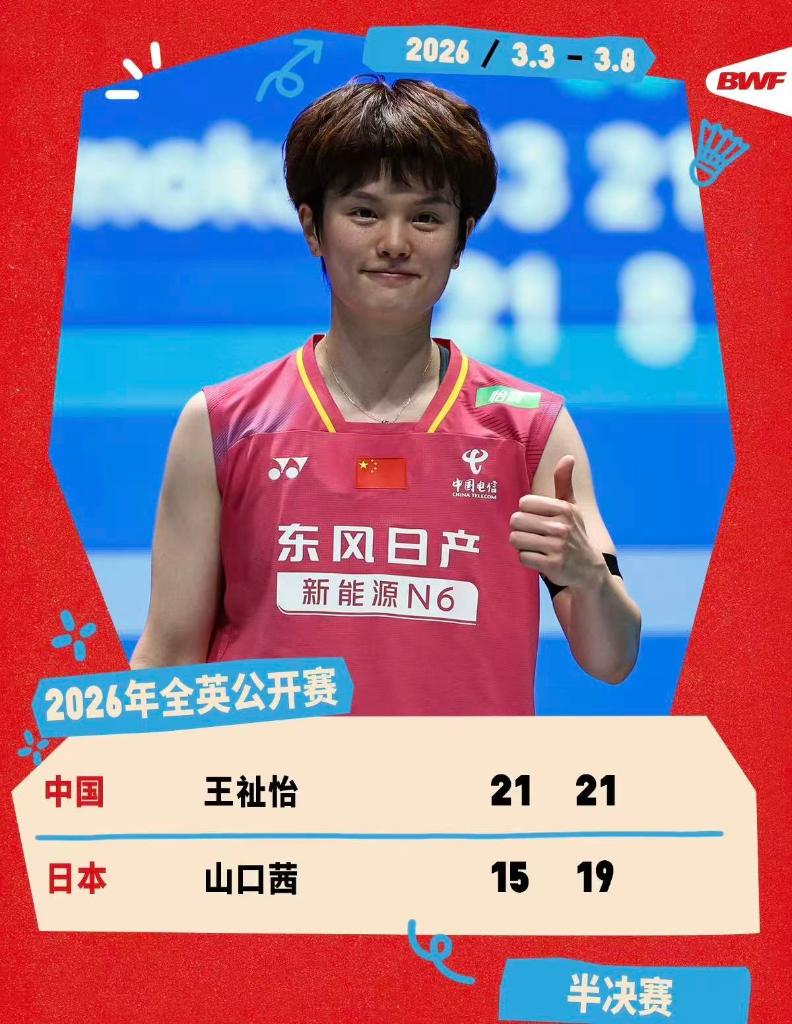 女单赛场,2号种子王祉怡以21:15、21:19挑落日本名将山口茜,锁定决赛名额。另一场半决赛中,3号种子陈雨菲在以22:20先赢一局的情况下未能守住优势,被韩国的头号种子安洗莹以21:9、21:12连扳两局逆转。