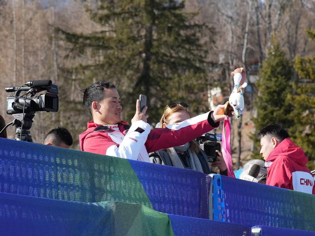新华社意大利科尔蒂纳丹佩佐3月8日电(记者郑直、李春宇、焦子琦)8日的米兰-科尔蒂纳冬残奥会残奥单板滑雪男子障碍追逐LL1级项目的颁奖仪式过后,武中伟举起手机,以环绕赛场的山峰为背景,给手中的金牌和吉祥物拍了一张照。尽管自己并未入镜,但整个采访区都能看得见他脸上的微笑。