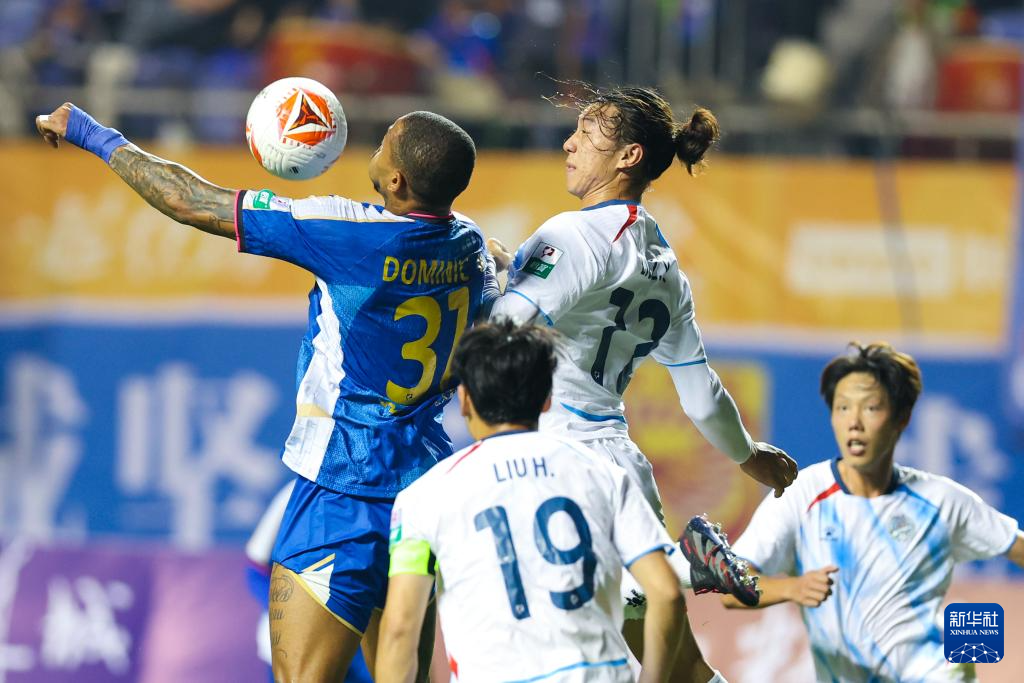 4月12日,石家庄功夫队球员多米尼克(上左)与佛山南狮队球员刘宗源(上右)在比赛中争顶。