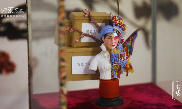 面塑俗稱面人,因?yàn)樗饕念}材都是人物,所以老百姓們也管它叫面人。這個是“三八婦女節(jié)”那天做的,我看到當(dāng)時(shí)有很多的醫(yī)護(hù)人員作為人類的代表跟另外一個物種去斗爭、保護(hù)我們,覺得她們還真的是很了不起的。想到以前巾幗英雄里邊穆桂英這個角色,加上京劇也是我們傳統(tǒng)文化中很寶貴的一個部分,就把這兩個結(jié)合在一起做了一個拼臉。