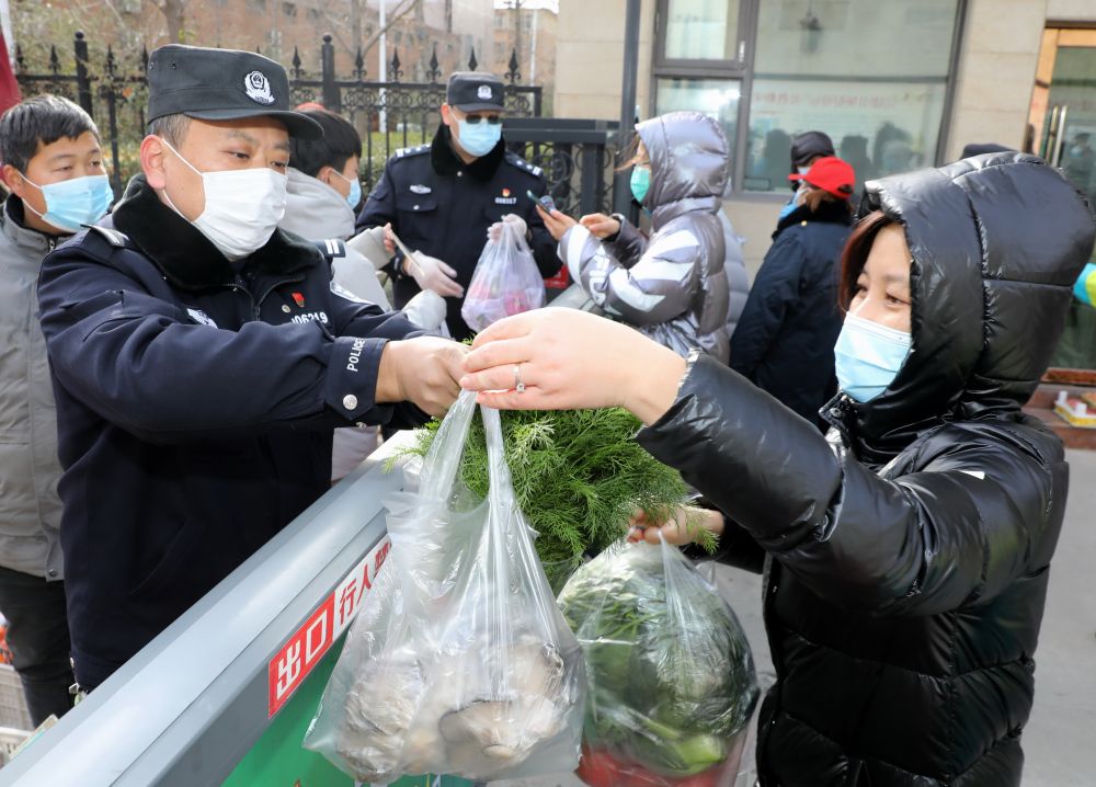 ↑ 1月10日,在石家莊市橋西區(qū)東風北路社區(qū),民警在協(xié)助蔬菜配送員為居民配送蔬菜。