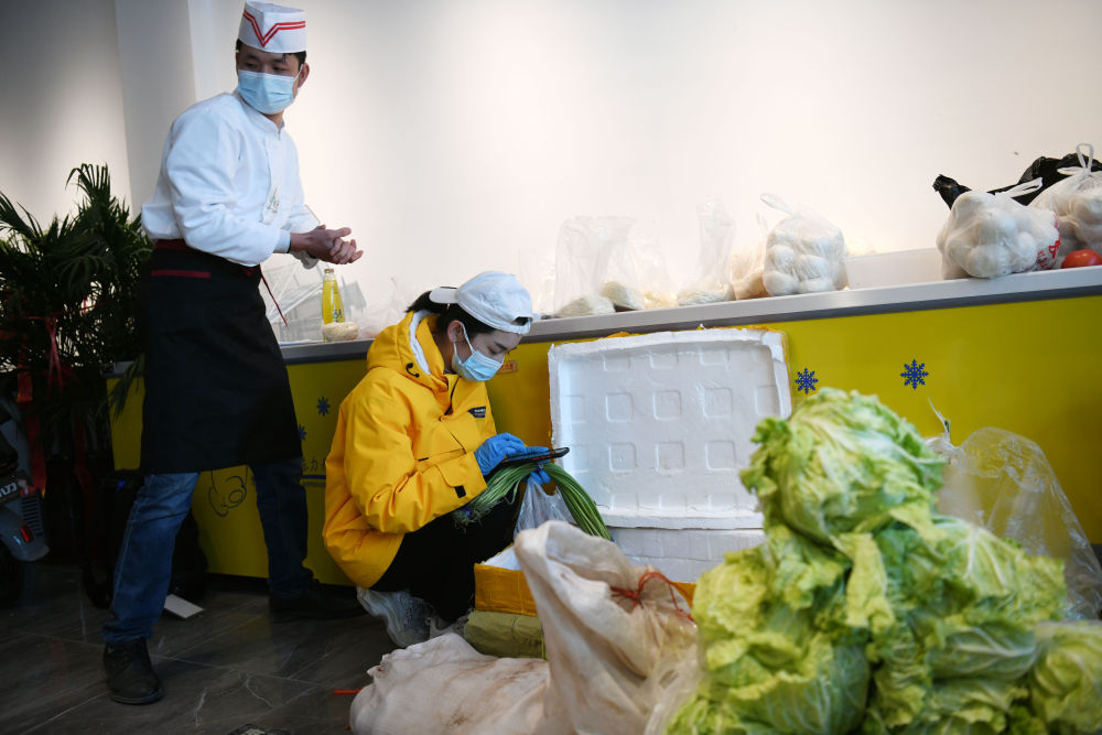 ↑1月11日,汪新建(左)和張琪琪夫婦在準備給鄰居們送菜。生活在河北石家莊市玉蘭苑小區(qū)的夫婦二人,在小區(qū)門口開了一家餐廳,夫妻倆帶著廚師和司機,為社區(qū)的工作人員免費提供盒飯,義務(wù)給鄰居們跑腿買菜。