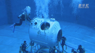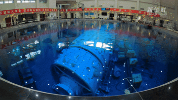 這里是航天員模擬失重水槽訓(xùn)練場。當(dāng)飛船繞地心運(yùn)動(dòng)時(shí),會(huì)產(chǎn)生失重。航天員要在失重狀態(tài)下進(jìn)行空間出艙活動(dòng)和裝配維修等任務(wù)。實(shí)踐證明,模擬失重水槽訓(xùn)練是在地面上進(jìn)行航天員艙外活動(dòng)訓(xùn)練的最為有效方法。