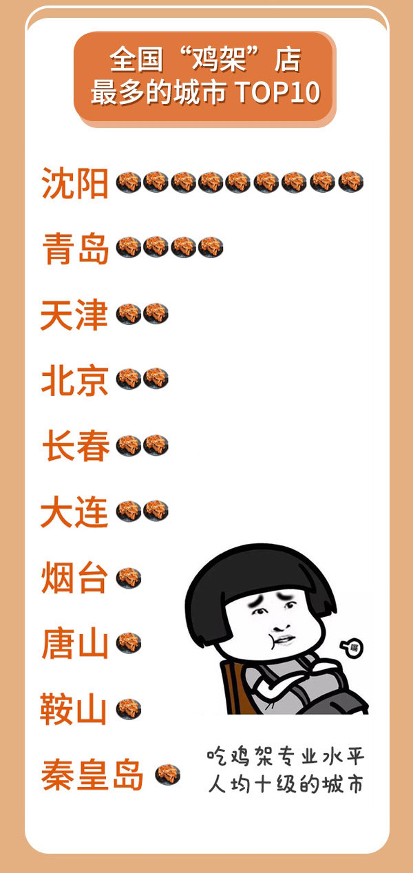 ????? 據(jù)高德地圖統(tǒng)計(jì),全國(guó)“雞架”店最多的城市非沈陽(yáng)莫屬,青島、天津、北京等城市也位于榜單前列。