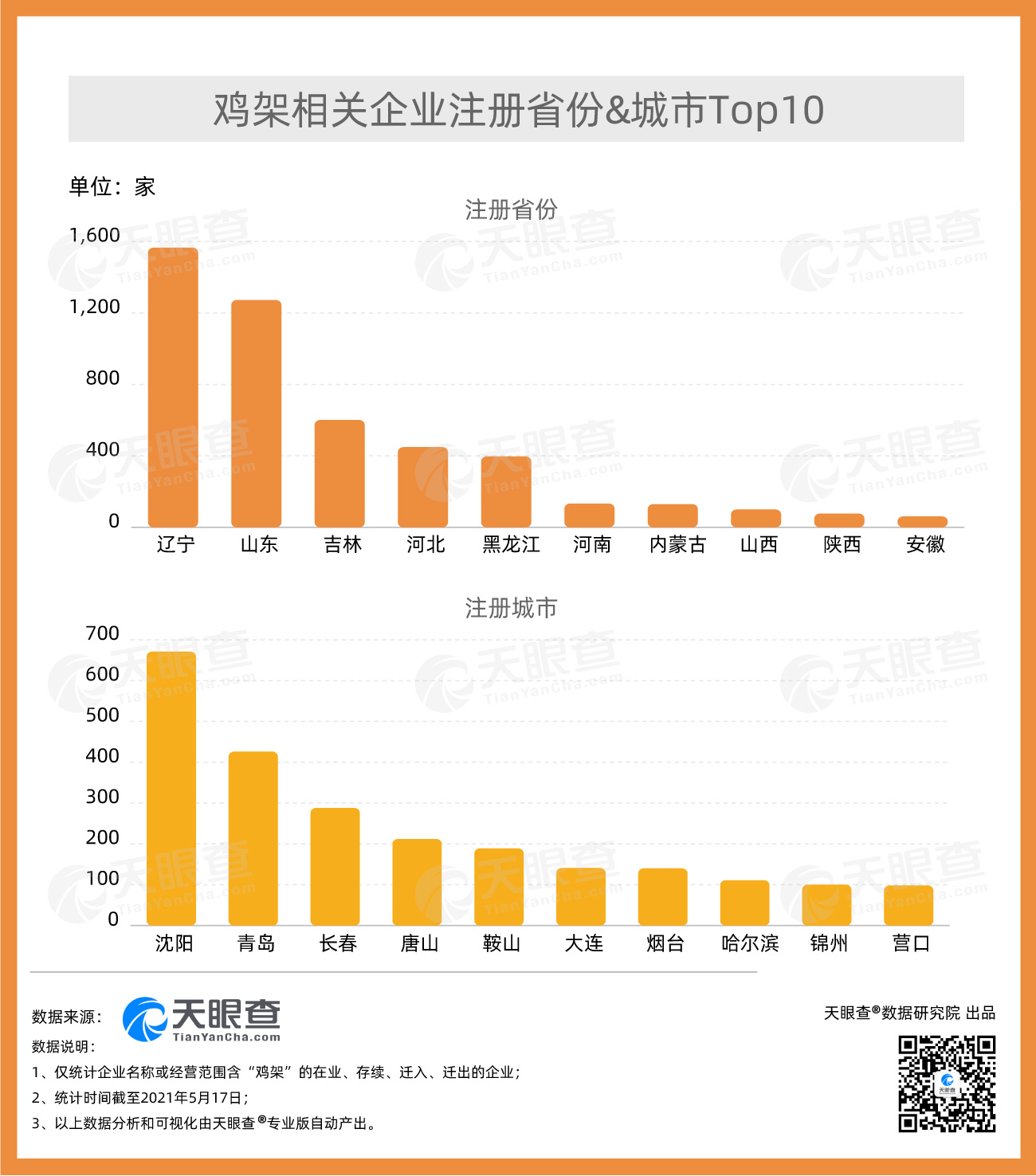 ????? 從地域分布上看,遼寧的雞架相關(guān)企業(yè)數(shù)量最多,有近1,600家,占全國(guó)近3成。其次為山東,有1,200余家雞架相關(guān)企業(yè)。分城市來(lái)看,沈陽(yáng)以670余家雞架相關(guān)企業(yè)位居全國(guó)首位,其次為青島,有400余家相關(guān)企業(yè)。天眼查數(shù)據(jù)顯示,近年來(lái)我國(guó)雞架相關(guān)企業(yè)年注冊(cè)量整體呈現(xiàn)上漲趨勢(shì)。2019年,我國(guó)新增2,200余家雞架相關(guān)企業(yè),年注冊(cè)量達(dá)到歷史最高。2020年,我國(guó)新增近2,000家雞架相關(guān)企業(yè)。