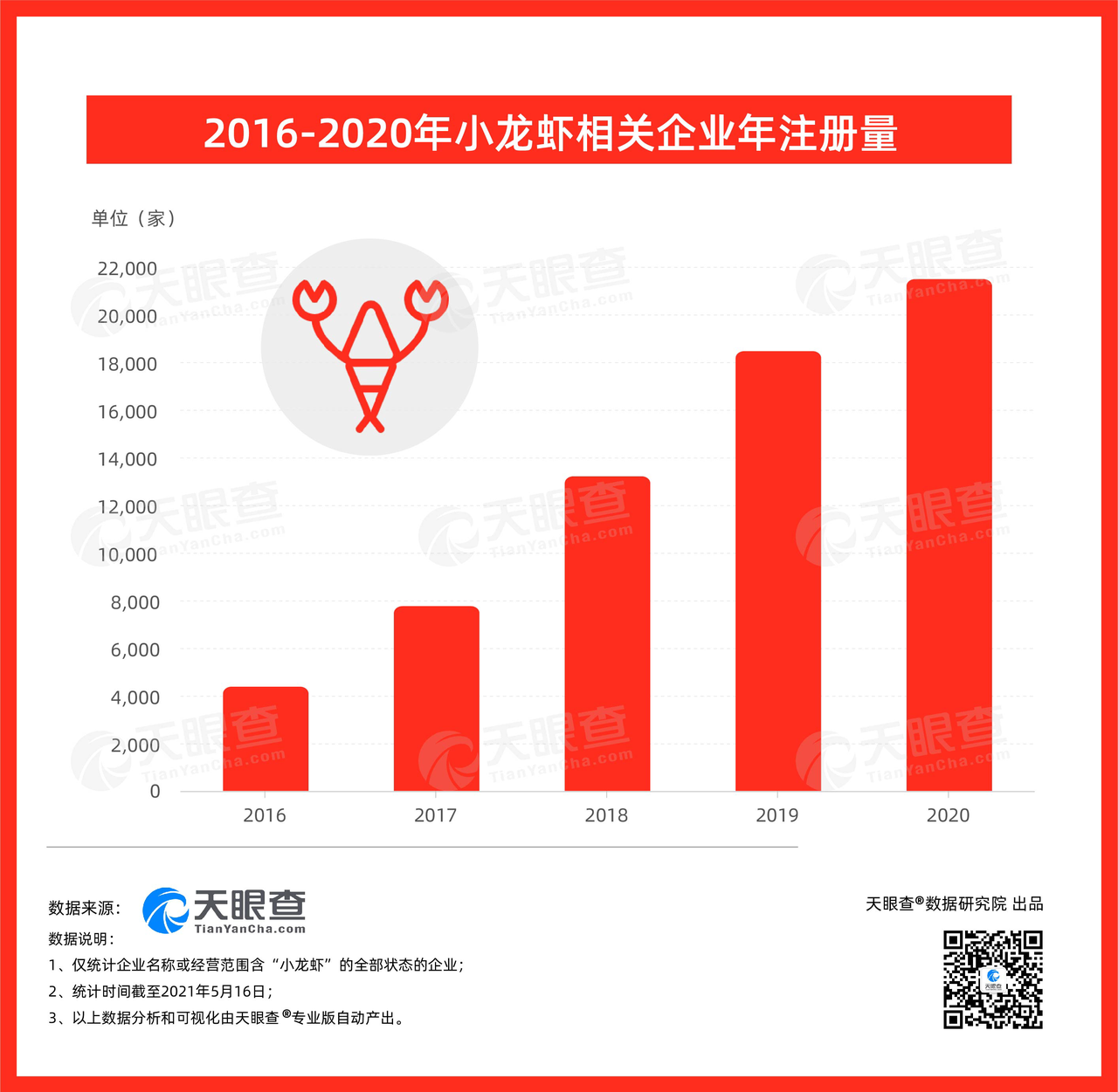????? 天眼查數(shù)據(jù)顯示,我國(guó)現(xiàn)有企業(yè)名稱(chēng)或經(jīng)營(yíng)范圍包括“小龍蝦”,且狀態(tài)為在業(yè)、存續(xù)、遷入、遷出的小龍蝦相關(guān)企業(yè)超1.7萬(wàn)家。其中,約9成的相關(guān)企業(yè)成立于5年以?xún)?nèi)。