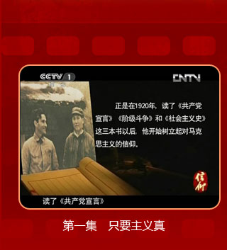 歷史文獻(xiàn)紀(jì)錄片《信仰》由中共中央組織部、中共中央文獻(xiàn)研究室、中共中央黨史研究室、中央電視臺(tái)聯(lián)合攝制。 歷史文獻(xiàn)紀(jì)錄片《信仰》,認(rèn)真貫徹落實(shí)黨的十七屆六中全會(huì)精神和胡錦濤總書記在慶祝中國(guó)共產(chǎn)黨成立90周年大會(huì)上的重要講話精神,以黨的90多年歷程為背景,以理想信念教育為主題,通過講述革命、建設(shè)、改革各個(gè)歷史時(shí)期優(yōu)秀共產(chǎn)黨員堅(jiān)持理想信念、發(fā)揮先鋒模范作用、保持先進(jìn)性和純潔性的故事,闡述了中國(guó)共產(chǎn)黨人的核心價(jià)值觀。[簡(jiǎn)介] [解說(shuō)詞] |
