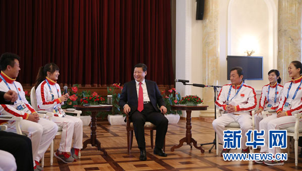??? 2月7日,中共中央總書記、國家主席、中央軍委主席習近平在俄羅斯索契親切看望參加第二十二屆冬季奧林匹克運動會的中國體育代表團。這是習近平同運動員親切交流。新華社記者 黃敬文 攝