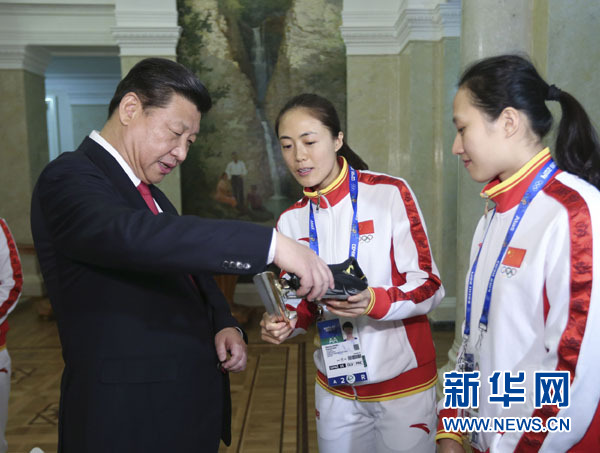 ??? 2月7日,中共中央總書記、國(guó)家主席、中央軍委主席習(xí)近平在俄羅斯索契親切看望參加第二十二屆冬季奧林匹克運(yùn)動(dòng)會(huì)的中國(guó)體育代表團(tuán)。這是運(yùn)動(dòng)員向習(xí)近平介紹冰雪運(yùn)動(dòng)器材。新華社記者 蘭紅光 攝