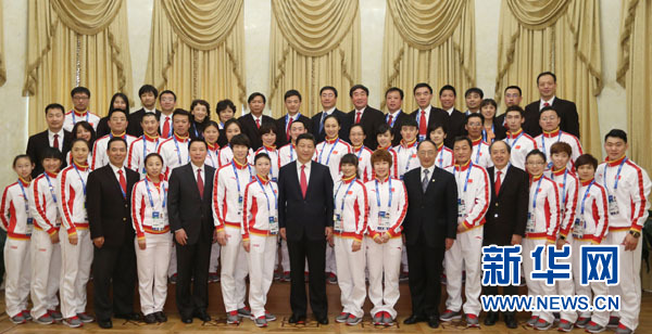 ??? 2月7日,中共中央總書記、國(guó)家主席、中央軍委主席習(xí)近平在俄羅斯索契親切看望參加第二十二屆冬季奧林匹克運(yùn)動(dòng)會(huì)的中國(guó)體育代表團(tuán)。這是習(xí)近平同代表團(tuán)成員集體合影。新華社記者 蘭紅光 攝