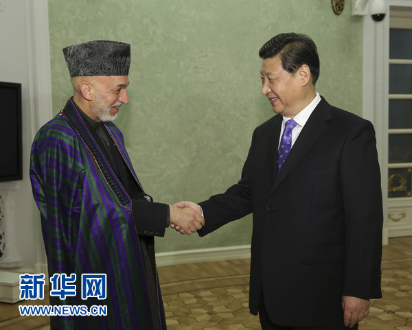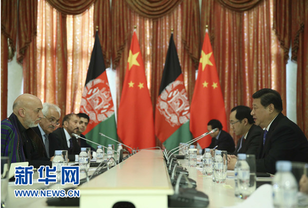 ????習(xí)近平指出,2014年之后,阿富汗的命運(yùn)將更加緊密地同地區(qū)國家聯(lián)系在一起。中方支持阿富汗融入地區(qū)經(jīng)濟(jì)合作。中方將于8月舉辦阿富汗問題伊斯坦布爾進(jìn)程第四次外長會(huì),我們?cè)竿⒎矫芮泻献鳎k好這次會(huì)議。中方也愿推動(dòng)上海合作組織在阿富汗問題上發(fā)揮更大作用。