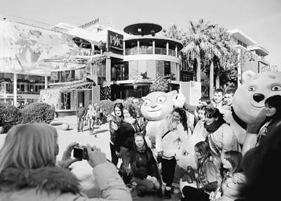 冬奧會(huì)期間,大批游客前往索契參觀游玩。圖為游客同冬奧會(huì)吉祥物合影留念。