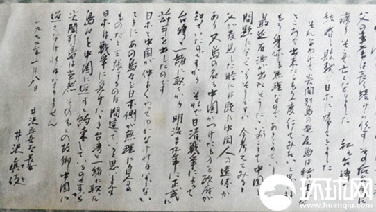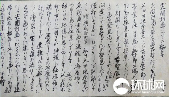 ????伊澤彌喜太長(zhǎng)女伊澤真伎1901年2月生于黃尾嶼。她于1972年1月8日口述并請(qǐng)人代筆,用毛筆寫下一份《關(guān)于尖閣列島的證言》,其中披露了其父伊澤彌喜太1891年首次登島開(kāi)發(fā)一事,并明確指出釣魚島“應(yīng)該歸還給它的故鄉(xiāng)——中國(guó)”。筆者現(xiàn)將部分證言的譯文公諸于眾:“我出生于尖閣列島(譯者注:釣魚島列島)的黃尾島古賀村。父親是井澤彌喜太(注:經(jīng)核實(shí)應(yīng)為伊澤彌喜太,屬于同音字記錄筆誤)。他曾任古賀辰四郎的業(yè)務(wù)主任,在該島經(jīng)營(yíng)干制鰹魚工廠,也采集信天翁的羽毛以及貝殼等?,F(xiàn)在報(bào)紙等報(bào)道稱古賀辰四郎是第一個(gè)發(fā)現(xiàn)該島嶼的人,這是彌天大謊,是絕對(duì)不可能的事情。因?yàn)橛忻魑挠涗浛梢宰C明,我父親于明治二十四年(1891年)航行至魚釣島(即釣魚島)、黃尾島,打撈海產(chǎn)品和采集信天翁的羽毛?!赣H登島后曾對(duì)其進(jìn)行調(diào)查,期間在一個(gè)洞穴里發(fā)現(xiàn)兩具身著中國(guó)服裝的骸骨?,F(xiàn)在看來(lái),在父親登島之前可能已有中國(guó)人達(dá)到此處。父親和古賀相識(shí)是因?yàn)楣刨R當(dāng)時(shí)很有錢,他曾主動(dòng)向父親提出:‘你在沖繩經(jīng)營(yíng)事業(yè)需要資金,我們一起合作怎么樣?!?yàn)槭枪刨R出資,所以名義上是古賀經(jīng)營(yíng),但一切事務(wù)實(shí)際上都是由我父親全權(quán)負(fù)責(zé)的。古賀也曾說(shuō)過(guò),他允許我父親在那里自主隨意地經(jīng)營(yíng)。