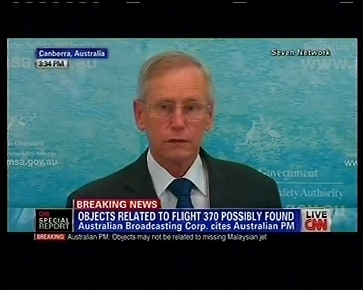 ??? 澳方稱在印度洋中發(fā)現(xiàn)了可能與馬航失聯(lián)客機有關(guān)物體這張3月20日拍攝的CNN視頻截圖顯示,澳大利亞海事安全局官員在堪培拉召開的新聞發(fā)布會上發(fā)言(左圖為相關(guān)搜尋海域的示意圖)。澳大利亞總理阿博特當日在議會說,澳方在印度洋中發(fā)現(xiàn)了可能與馬航失聯(lián)客機有關(guān)的兩個物體。澳大利亞海事安全局官員當日說,發(fā)現(xiàn)可疑碎片的位置與之前確定的馬航失聯(lián)客機南部搜尋航道高度吻合,但當?shù)睾S蛩沫h(huán)境非常差。新華社發(fā)