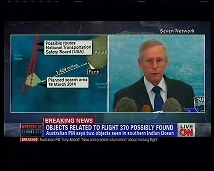 ??? 澳方稱在印度洋中發(fā)現(xiàn)了可能與馬航失聯(lián)客機(jī)有關(guān)物體這張3月20日拍攝的CNN視頻截圖顯示,澳大利亞海事安全局官員在堪培拉召開(kāi)的新聞發(fā)布會(huì)上發(fā)言。澳大利亞總理阿博特當(dāng)日在議會(huì)說(shuō),澳方在印度洋中發(fā)現(xiàn)了可能與馬航失聯(lián)客機(jī)有關(guān)的兩個(gè)物體。澳大利亞海事安全局官員當(dāng)日說(shuō),發(fā)現(xiàn)可疑碎片的位置與之前確定的馬航失聯(lián)客機(jī)南部搜尋航道高度吻合,但當(dāng)?shù)睾S蛩沫h(huán)境非常差。新華社發(fā)