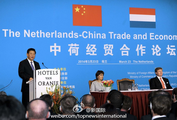 ????新華網(wǎng)北京3月24日電 據(jù)新華社“新國際”微博報道, 習近平主席出席中荷經(jīng)貿(mào)合作論壇開幕式,暢談豐碩合作成果。他還說:“荷蘭足球隊被稱為世界足球的‘無冕之王’。荷蘭是‘歐洲菜籃子’和‘郁金香王國’?!绷暯竭@番話博得滿場掌聲和笑聲。