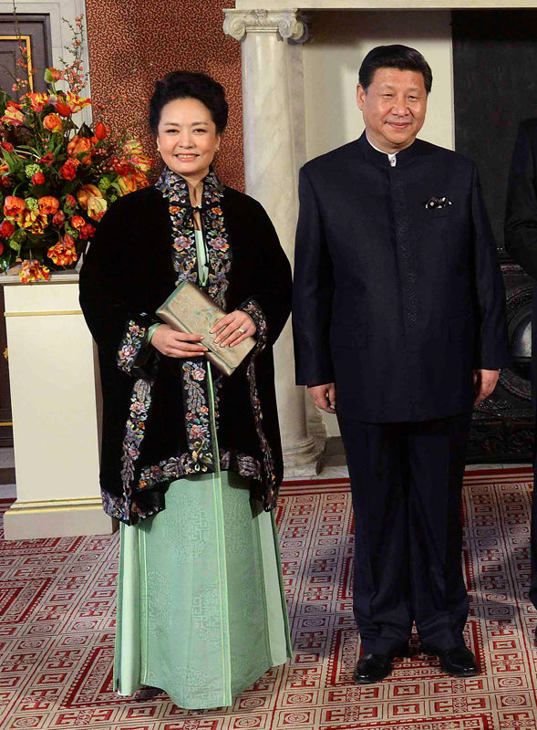 ——在抵達荷蘭接受荷蘭國王和王后迎接時,習主席以西裝搭配藍色圓點領帶,接近大海的深藍色帶給人們如大海一般浩瀚的包容感,圓點圖案亦與夫人彭麗媛的絲巾相呼應。彭麗媛選擇的是西式改良的中長款灰色外套。灰色是高品位的象征,也是當下流行的歐洲色彩,這一選擇體現(xiàn)了對出訪國家的尊重;中式立領非常具有中國傳統(tǒng)特色,高腰線的設計也符合當下的時尚流行。