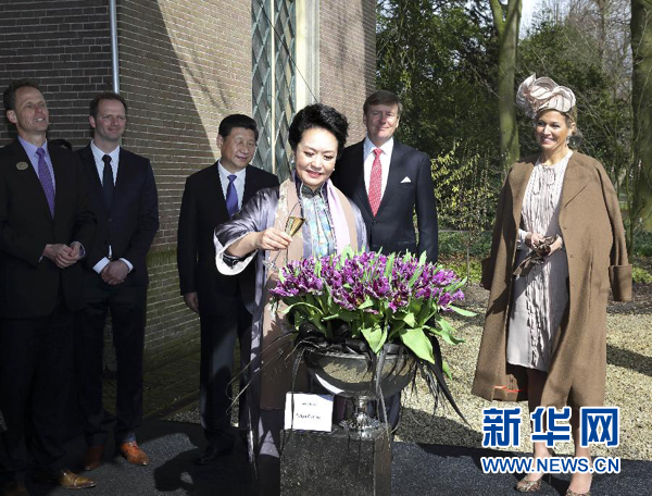 3月23日,中國國家主席習近平和夫人彭麗媛在荷蘭國王威廉-亞歷山大和馬克西瑪王后陪同下參觀中荷農業(yè)合作和荷蘭郁金香花展。彭麗媛應邀將新培育的郁金香命名為“國泰”,并按當?shù)貍鹘y(tǒng)澆上香檳。資料圖