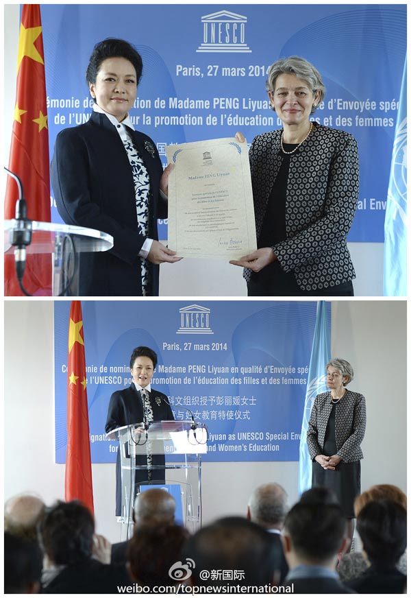 ????新華網(wǎng)北京3月27日電 據(jù)新華社“新國際”微博報道,習(xí)近平主席夫人彭麗媛27日在巴黎聯(lián)合國教科文組織總部被授予“促進(jìn)女童和婦女教育特使”榮譽(yù)稱號。從博科娃總干事手中接過證書后,彭麗媛說,這是一項崇高的事業(yè),我愿意盡我所能,幫助更多孩子,為更多姐妹爭取接受教育的權(quán)利。
