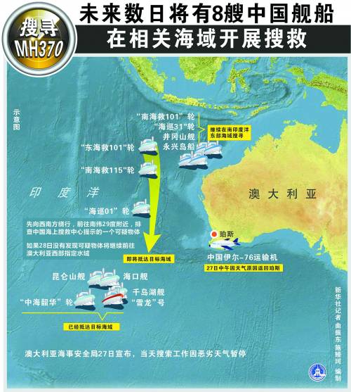 目前,馬航失聯(lián)客機(jī)搜救工作已進(jìn)入第三階段。按照“明確方向、增加力量、連續(xù)作戰(zhàn)、整體推進(jìn)”的部署,中國(guó)海上搜救中心進(jìn)一步優(yōu)化了后續(xù)搜尋方案。我方現(xiàn)在有12艘艦船、8架艦載直升機(jī)、3架固定翼飛機(jī)已經(jīng)到達(dá)或者正在趕往南印度洋海域開(kāi)展搜尋,我國(guó)已成為水面搜救主力,當(dāng)前的主要任務(wù)是搜尋與失聯(lián)飛機(jī)有關(guān)的所有可疑物體。