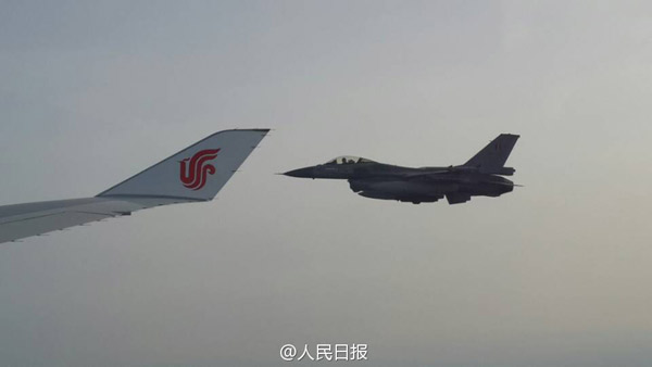 ????當(dāng)習(xí)近平乘坐的專機進入比利時領(lǐng)空時,比利時皇家空軍兩架戰(zhàn)機升空護航。(圖片來源:《人民日報》法人微博)