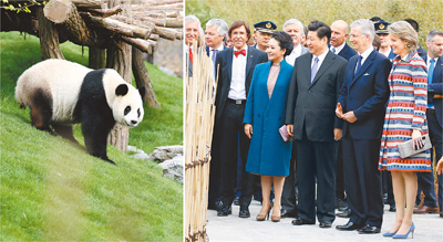 習(xí)近平和夫人彭麗媛抵達(dá)時(shí),受到菲利普國(guó)王和瑪?shù)贍柕峦鹾?、比利時(shí)首相迪呂波熱情迎接。兩國(guó)領(lǐng)導(dǎo)人一同步入中國(guó)園。亭臺(tái)樓閣、雕梁畫棟、鳥語花香,這里宛如一幅恬靜祥和的中華寫意畫。兩國(guó)元首夫婦沿著回廊曲徑,穿過青翠竹林,前往大熊貓園。他們邊走邊談,回顧中比兩國(guó)友好交往。