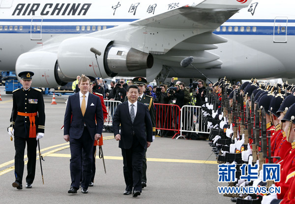 ??? 3月22日,國(guó)家主席習(xí)近平抵達(dá)阿姆斯特丹,應(yīng)荷蘭國(guó)王威廉-亞歷山大邀請(qǐng),對(duì)荷蘭進(jìn)行國(guó)事訪問(wèn),開(kāi)啟歐洲之旅。威廉-亞歷山大在機(jī)場(chǎng)為習(xí)近平舉行隆重歡迎儀式。這是習(xí)近平在威廉-亞歷山大陪同下檢閱儀仗隊(duì)。新華社記者 鞠鵬 攝