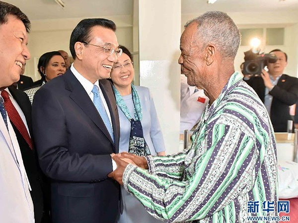 ??? 5月6日,中國國務(wù)院總理李克強與埃塞俄比亞總統(tǒng)穆拉圖一同來到亞的斯亞貝巴阿勒塔醫(yī)院,看望受益于中國免費白內(nèi)障手術(shù)“光明行”活動的埃塞俄比亞患者。新華社記者李濤攝