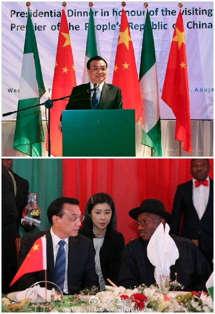 ??? 新華網(wǎng)北京5月8日電? 據(jù)新華社“新國際”微博報(bào)道,當(dāng)?shù)貢r(shí)間7日晚,尼日利亞總統(tǒng)喬納森夫婦在總統(tǒng)府為李克強(qiáng)總理和夫人程虹舉行隆重歡迎宴會(huì)?,F(xiàn)場尼方兩次奏響中國國歌,感謝李克強(qiáng)在尼安全局勢嚴(yán)峻時(shí)刻“冒險(xiǎn)”訪問,感謝中方對尼的巨大支持。