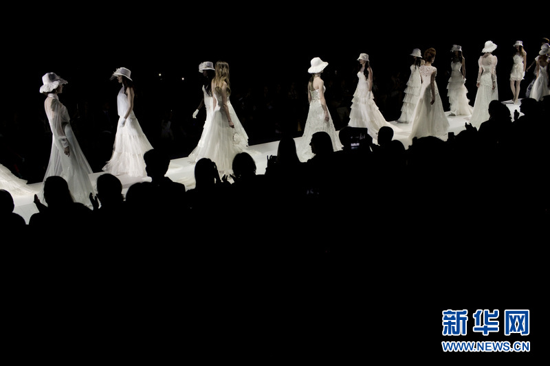 模特在T臺(tái)上展示西班牙女服裝設(shè)計(jì)師 Inmaculada Garcia的婚紗作品。Inmaculada Garcia同時(shí)也是來(lái)自巴塞羅那當(dāng)?shù)氐囊粋€(gè)婚紗品牌。