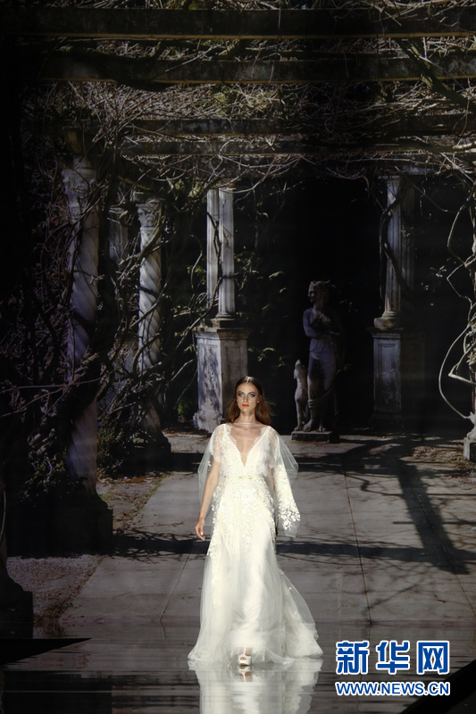 模特在T臺上展示西班牙品牌Yolan Cris的婚紗。Yolan Cris品牌由Yolanda和Cristina姐妹聯(lián)手打造,同時這也是來自巴塞羅那當?shù)氐囊粋€婚紗品牌。