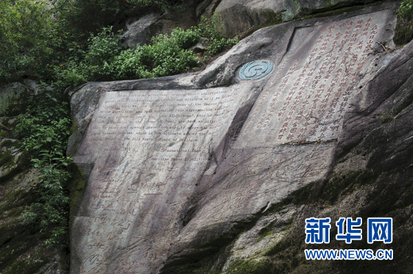 ??? 走進那段記錄在石壁上的海絲歷史聯(lián)合國教科文組織“海絲”考察隊于1991年觀摩祈風石刻,認定此為宋元時期海上絲綢之路起點的文物佐證,并做中英文新刻(5月8日攝)。 26年來,今年65歲的文物管理所原所長胡家其老人已經(jīng)記不得多少次向人們講述九日山作為宋元時期海上絲綢之路起點的歷史,但他從不言倦。福建泉州豐州鎮(zhèn)九日山因“山中無石不刻字”而與眾不同。這座海拔只有一百多米的小山現(xiàn)存古代摩崖石刻77方,其中宋代石刻61方。這61方石刻中又有10方直接與海上絲綢之路有關(guān),記錄了公元1174年至1266年期間11次官辦祈風儀式。新華社記者 姜克紅 攝