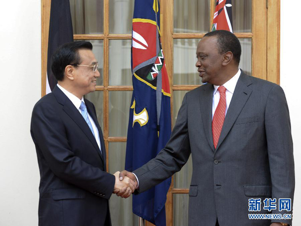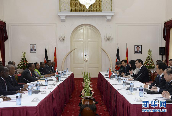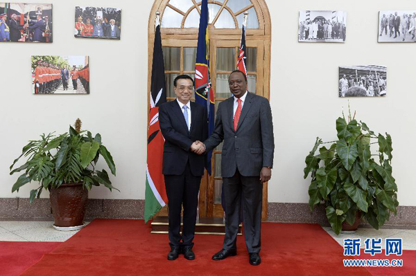 ????肯雅塔代表肯尼亞政府和人民熱烈歡迎李克強(qiáng)訪肯,表示在周恩來(lái)總理訪非50周年之際,李克強(qiáng)總理對(duì)非洲進(jìn)行的里程碑式訪問(wèn)取得圓滿成功,將進(jìn)一步深化非中新型戰(zhàn)略伙伴關(guān)系??现杏兄嗤臍v史遭遇和發(fā)展任務(wù),肯方感謝中方對(duì)肯經(jīng)濟(jì)社會(huì)發(fā)展和保護(hù)生態(tài)環(huán)境、野生動(dòng)物資源的幫助和支持,高度贊賞中國(guó)為維護(hù)非洲和平與發(fā)展作出的重要貢獻(xiàn),完全贊同李克強(qiáng)總理在非盟演講中提出的“461”非中合作框架和在世界經(jīng)濟(jì)論壇非洲峰會(huì)特別致辭中提出的合作建設(shè)非洲基礎(chǔ)設(shè)施“三大網(wǎng)絡(luò)”的主張,愿與中方加強(qiáng)戰(zhàn)略溝通,全面推進(jìn)各領(lǐng)域合作,實(shí)現(xiàn)共同發(fā)展??戏皆缸鲋袊?guó)企業(yè)進(jìn)入非洲的門(mén)戶,為推動(dòng)非中合作發(fā)揮積極作用。