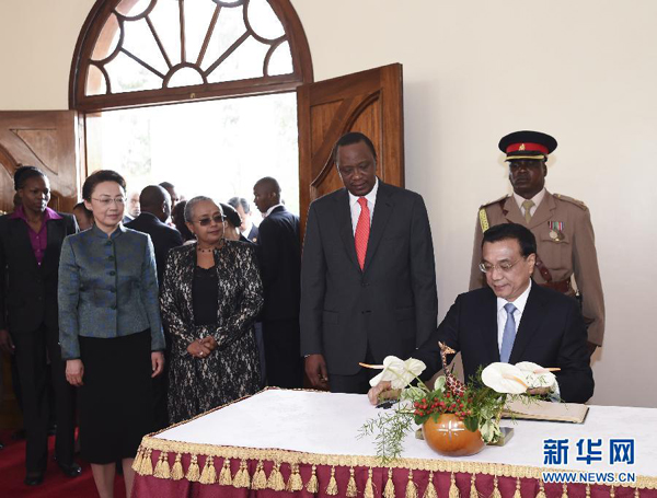 ??? 5月10日,中國(guó)國(guó)務(wù)院總理李克強(qiáng)在肯尼亞國(guó)家宮同肯總統(tǒng)肯雅塔舉行會(huì)談。這是會(huì)談開(kāi)始前,李克強(qiáng)在貴賓簿上簽名。 新華社記者 李學(xué)仁 攝