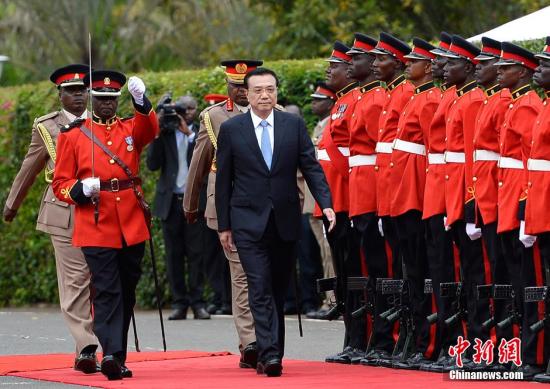 5月10日,中國國務(wù)院總理李克強在肯尼亞總統(tǒng)府廣場出席肯總統(tǒng)肯雅塔舉行的歡迎儀式。中新社發(fā) 劉震 攝