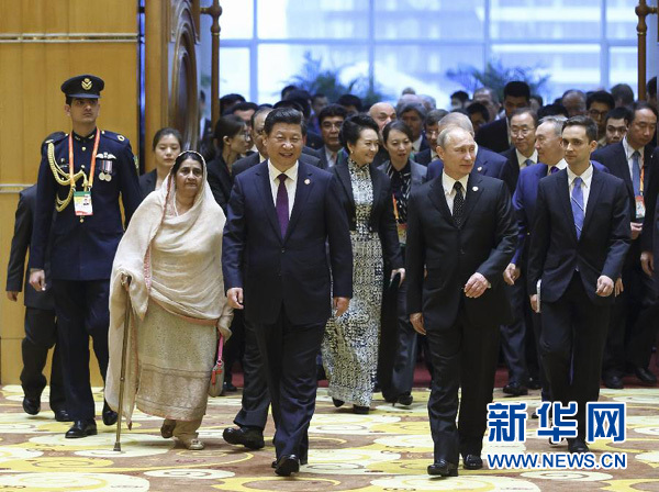 ??? 5月20日,國家主席習(xí)近平在上海國際會(huì)議中心舉行宴會(huì),代表中國政府和人民,歡迎前來出席亞洲相互協(xié)作與信任措施會(huì)議第四次峰會(huì)的各國貴賓。這是習(xí)近平和彭麗媛同各國貴賓一起步入宴會(huì)廳。新華社記者 蘭紅光 攝